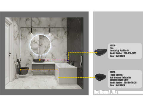 BOCCHI Etna Countertop Washbasin Model Number : 1112-004-0125 Color : Matt Black BOCCHI Fenice Rimless Wall Mounted Toilet with Concealed Bidet Entry Model Number : 1166-004-0129 Color : Matt Black Bed Room A , W.c
