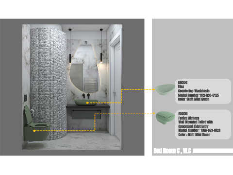 BOCCHI Etna Countertop Washbasin Model Number :1112-033-0125 Color :Matt Mint Green BOCCHI Fenice Rimless Wall Mounted Toilet with Concealed Bidet Entry Model Number : 1166-033-0128 Color : Matt Mint Green Bed Room C , W.C